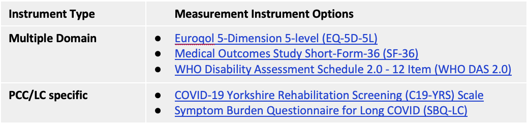 Consensus was also not reached for any multiple domain measurement instrument, nor any PCC/LC-specific measurement instrument. The below Table indicates measurement instruments with the highest level of support based on the consensus process. At the online consensus meeting, there was a very high level of support for future research focused on a consensus process regarding use of existing outcome measurement instruments versus Long COVID-specific instruments versus a combination of both types of instruments for PCC/LC research and clinical practice.